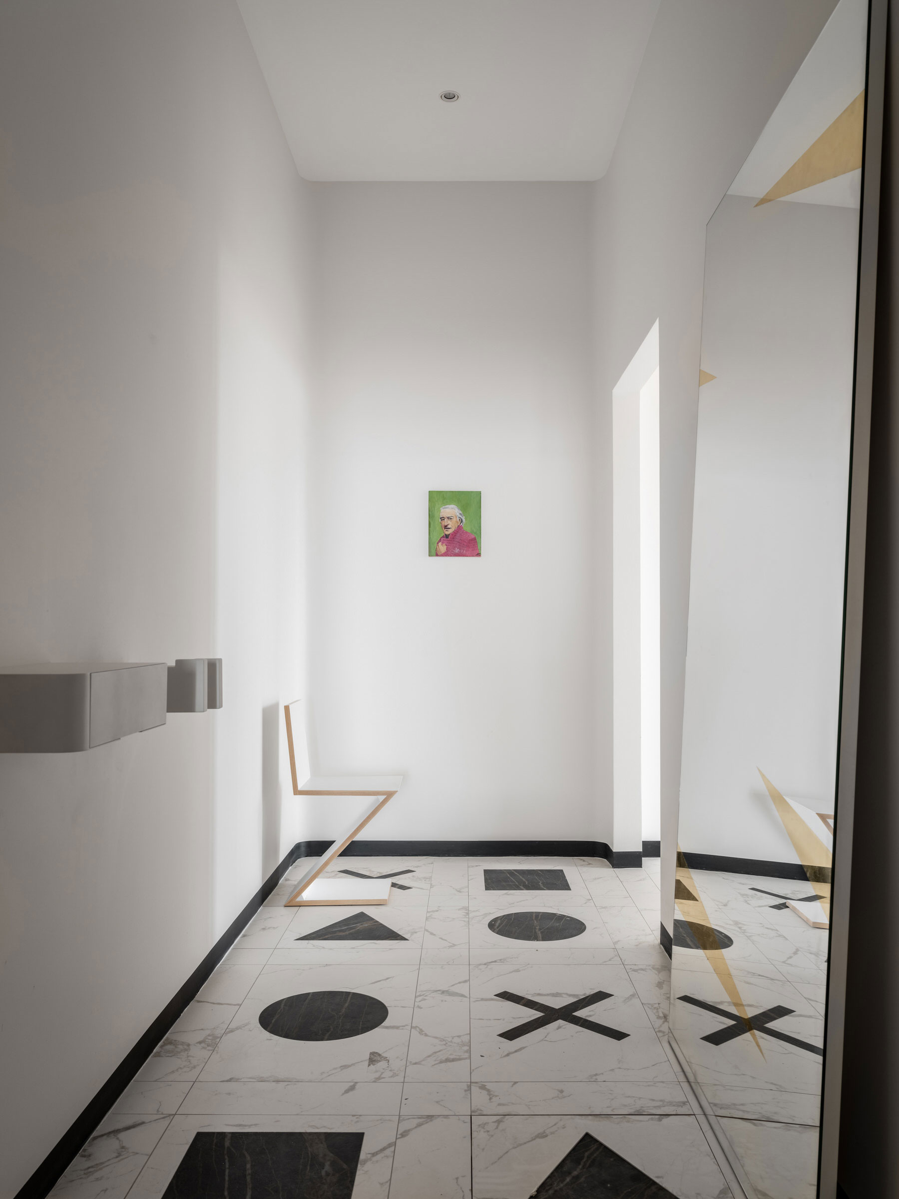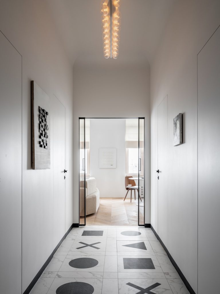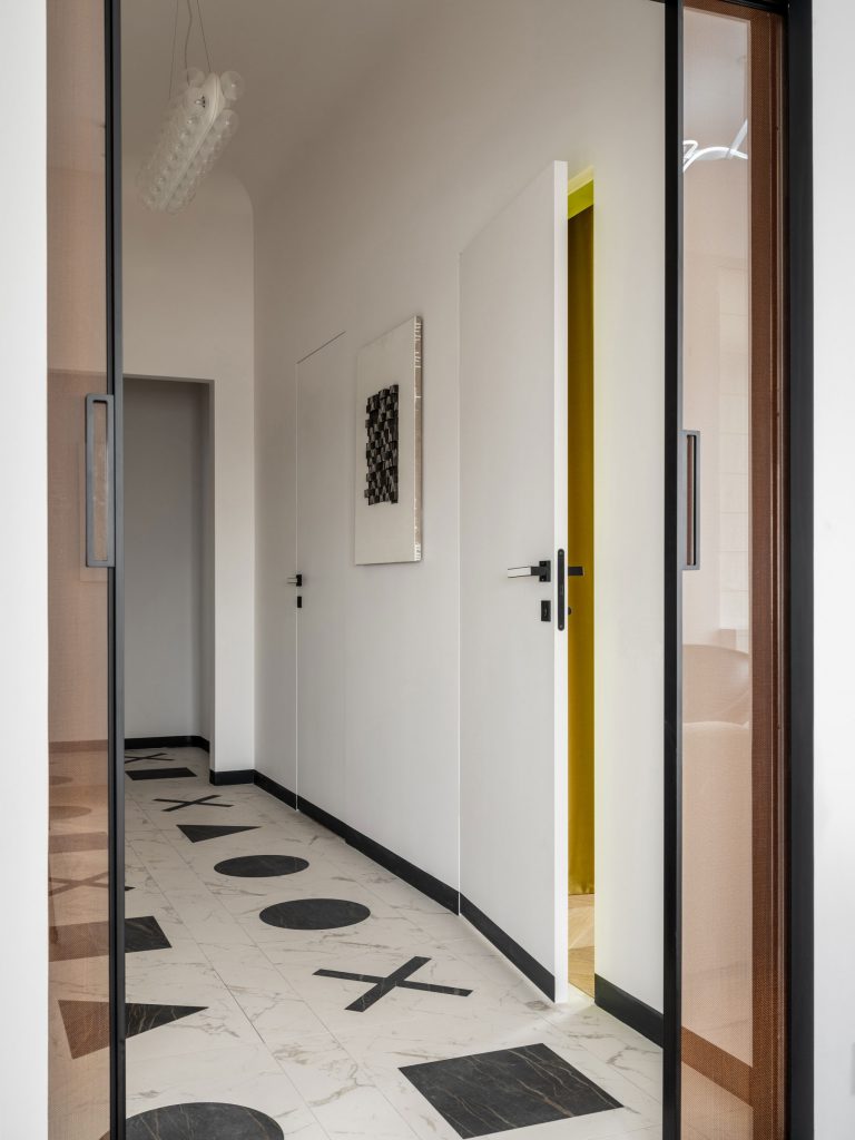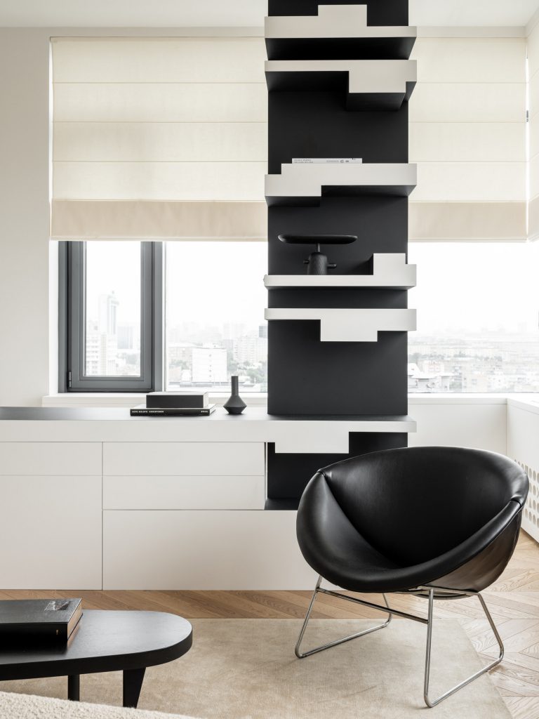 Šiame projekte interjero dizaineris ir menininkas Sergejus Khrabrovsky buvo įkvėptas rusiško Avant-garde konstruktyvizmu, meno ir architektūros judėjimas kuris buvo ypač populiarus 1920-iais. Daugelis specialiai pagamintų baldų išdestitu 74 kvadratų plote laikosi tos pačios estetikos, o pačio dizaineriu sukurti meno kūriniai padeda sukurti žaismingumo nuotaika. Buto lankytojus pasitinka geometriškas juodai – baltas prieškambaris. Balto marmuro grindys yra kartais pertrauktos grafiškomis formomis iš kontrastingų atspalvių akmens. Tokiu būdų patalpa kuri yra dažnai ignoruojamą tampa labiau panaši į šachmatų lenta negu į paprasta prieškambarį.