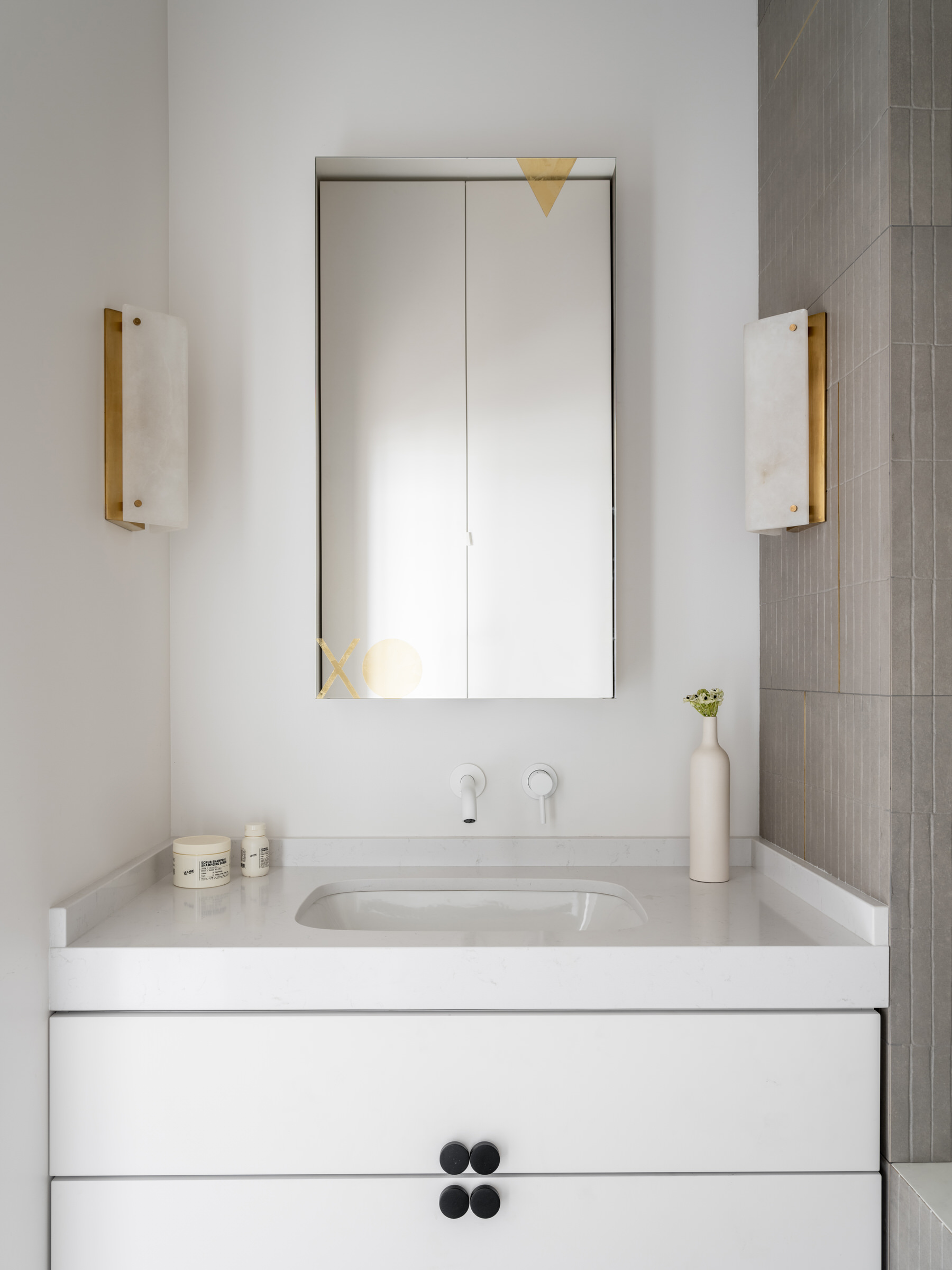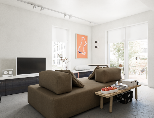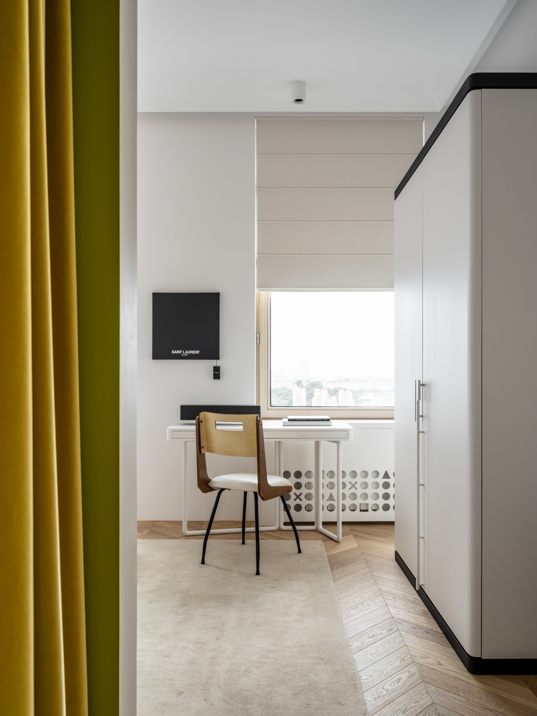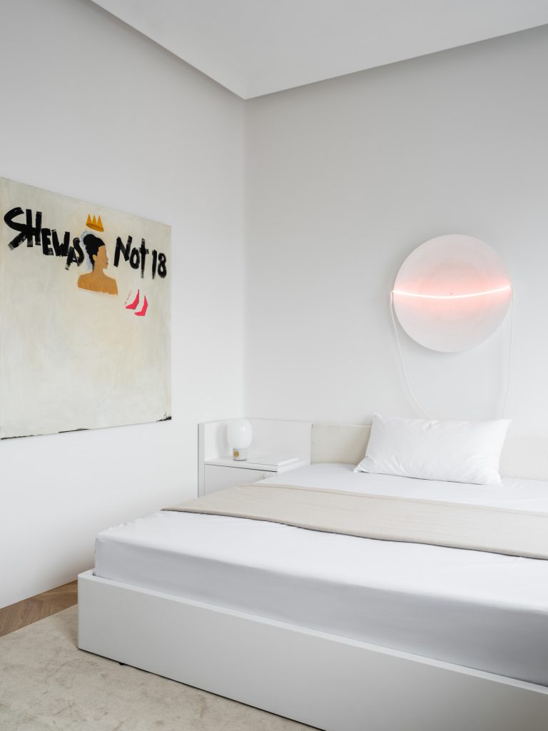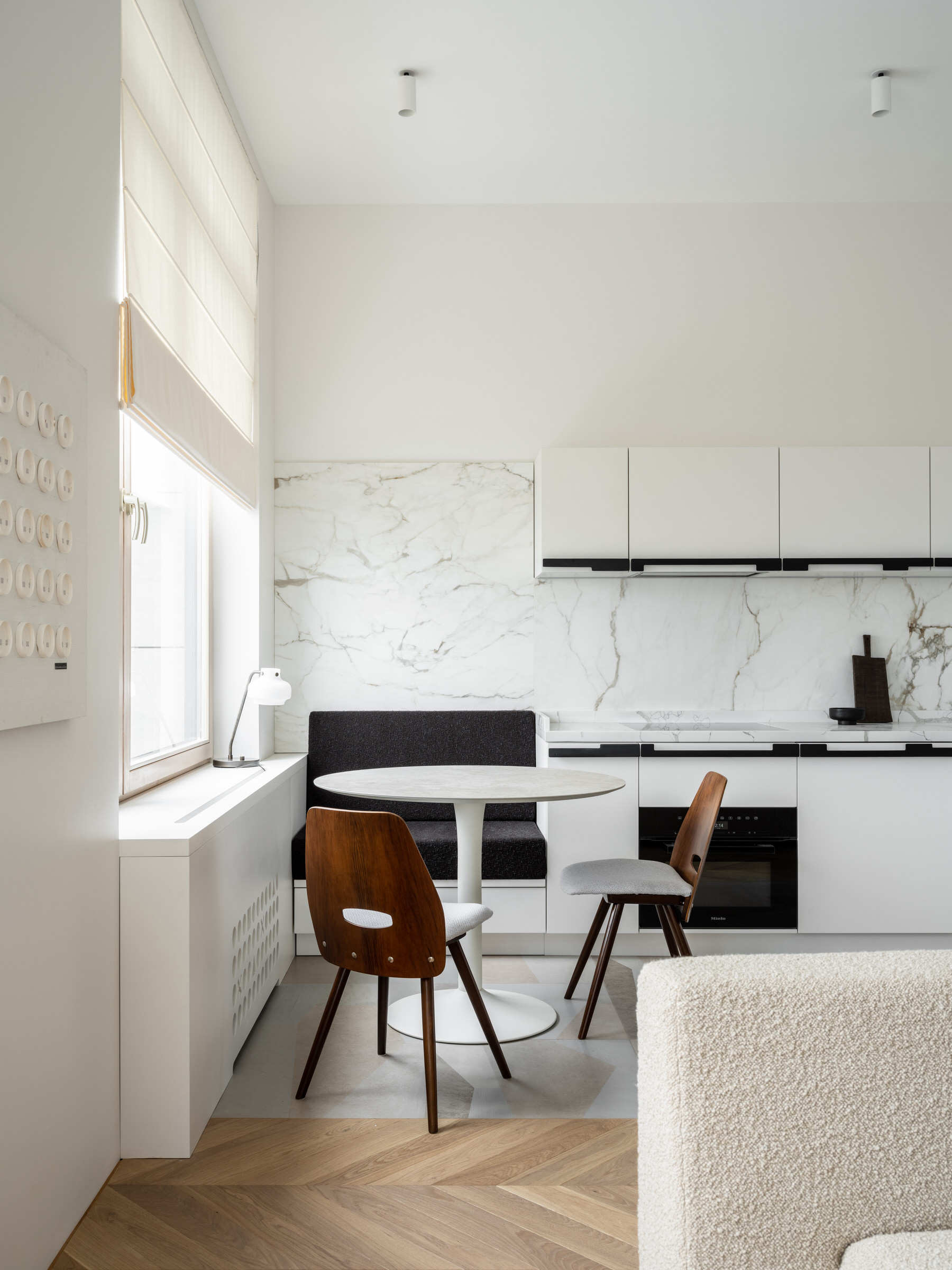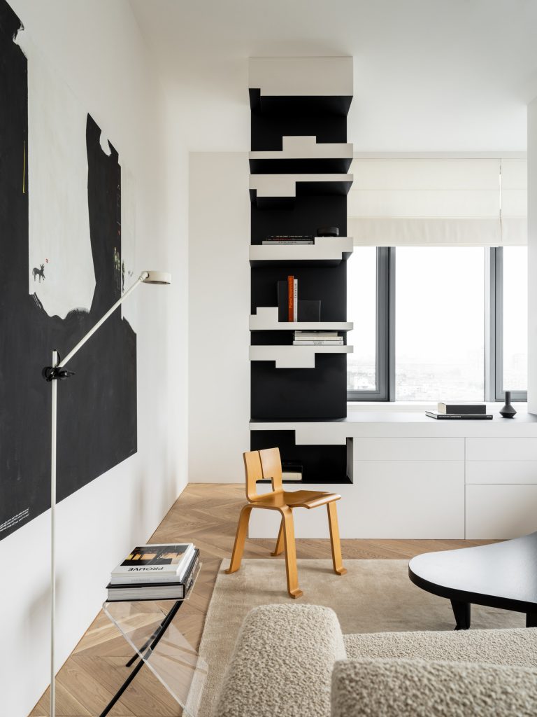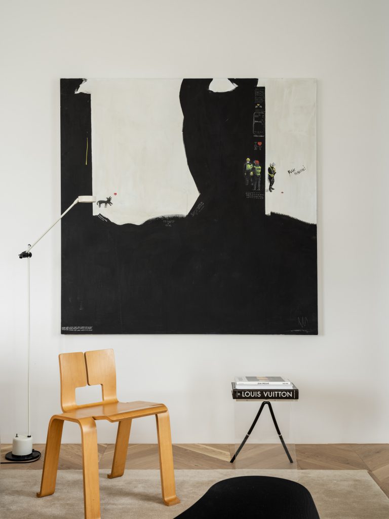 Šį kūrybos energiją yra aiškiai matoma ir kituose buto patalpose. Juodas kavos staliukas puikiai priderintas prie specialiai suprojektuotų lentynų, abudu tarnaudami kaip vizualiniai pagrindai tarp šviesesnių tonų. Išskirtinės detalės kaip “Ombra Tokyo” (Charlotte Perriand) ir “Zig-zag” (Rietveld) kėdės buvo perkamos tiesiai iš “Cassina”. Yra itin švelnus tekstūrų ir medžiagų derinimas kur juoda natūrali oda yra kombinuojama su medžiu ir minkštomis, grublėtomis tekstilėmis. Galutinis rezultatas gaunasi jaukus ir elegantiškas interjeras kur tuo pačiu metu jaučiasi šiuolaikiška, kupina individualumo estetika. Kombinacija kuria aš asmeniškai labai vertinu.