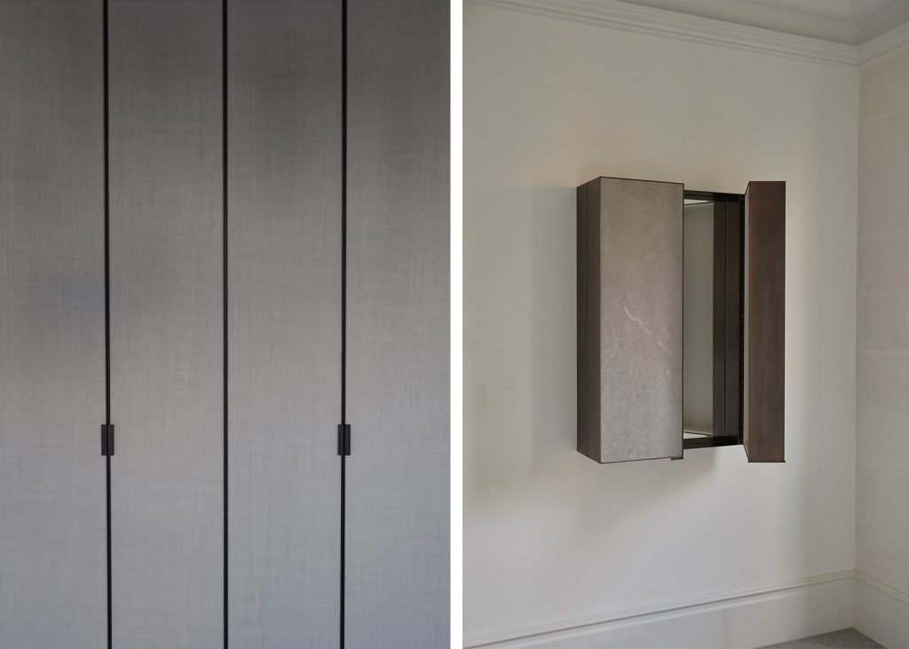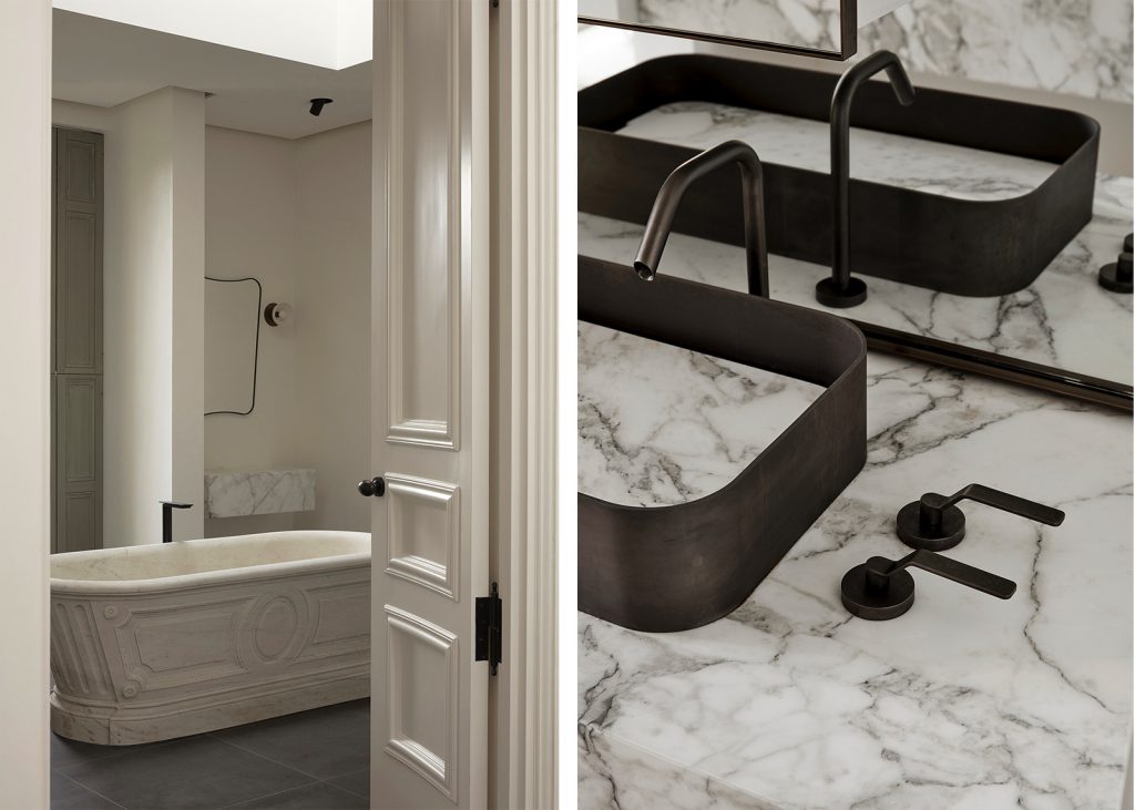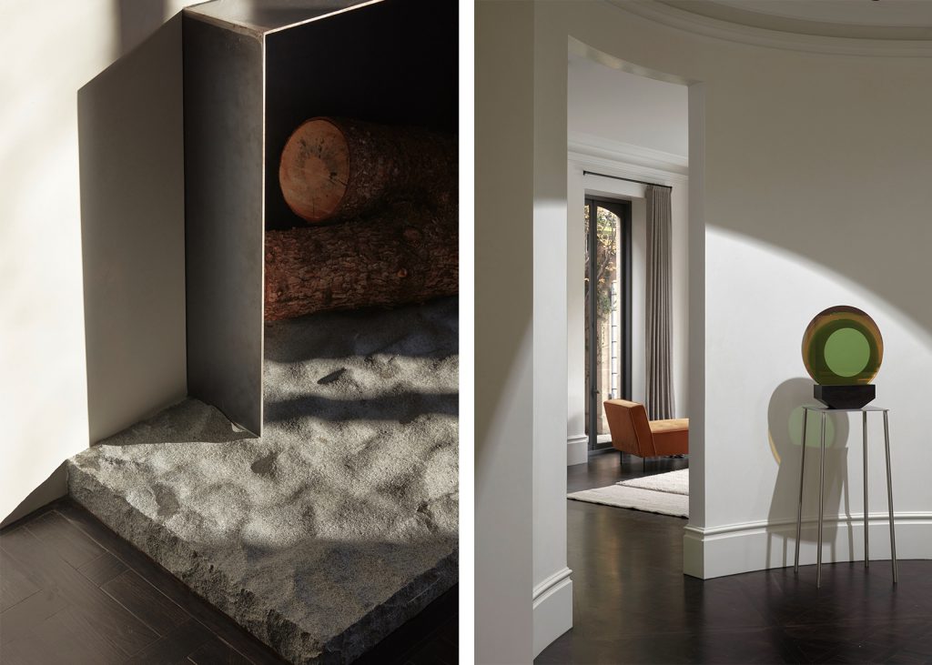 Svetainė išcentruota aplink įspūdingo grubiai apdirbto židinio kur neutralios tekstūros ir švelnus aplinkos apšvietimas sukuria intymumo ir ramybės jausmą. Virtuvė ir vonia yra dekoruoti iškaltais ir skulptūriniais akmens bruožais kurie sukelia jausmą, kad erdvė buvo iškirsta iš vienos monolitinės formos. Subtilus paviršiai žavingai papildo namo įmantrų medinį grindų parketą ir langinės prancūziškas durys.